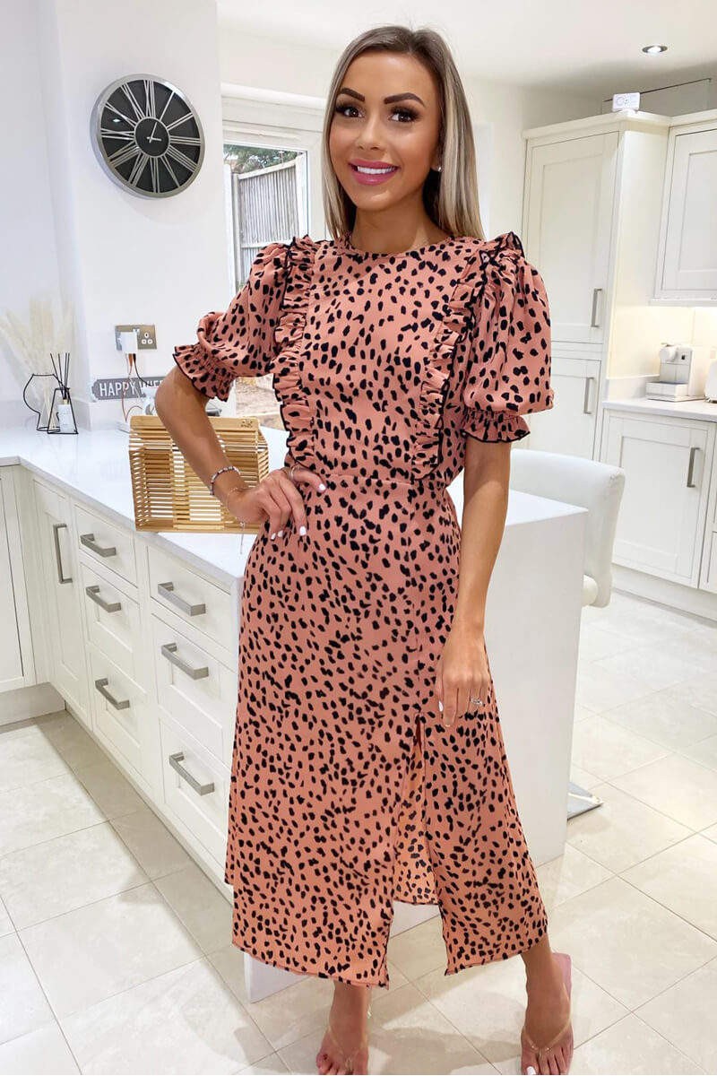 Peach Printed Ruffle Split Leg Midi Dress